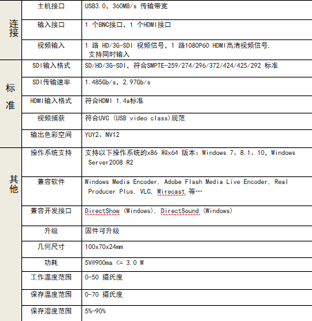 360MB/s USB3.0传输带宽 支持3G-SDI和HDMI视频信号采集 视频格式最高1080P60