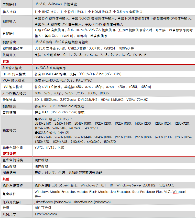 单路DVI/HDMI/3G-SDI数字视频输入 单路VGA/CVBS/YPbPr/YCbCr/YC模拟视频输入
