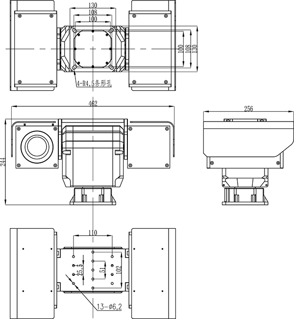 照射距离>3000米 水平360°连续 垂直-90~+45° 防护等级IP66