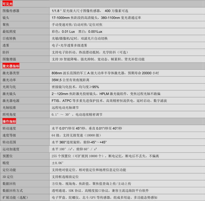 1000mm 变焦镜头 电动光轴调节机构,方便校正光轴偏差 激光同步变焦,画面中的照明范围自动匹配