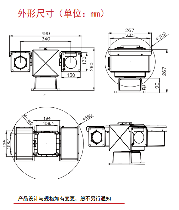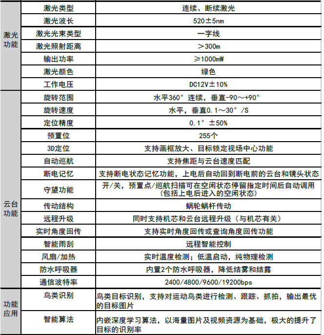 激光照射距离>300米 水平360°连续 垂直-90~+90° 防护等级IP67